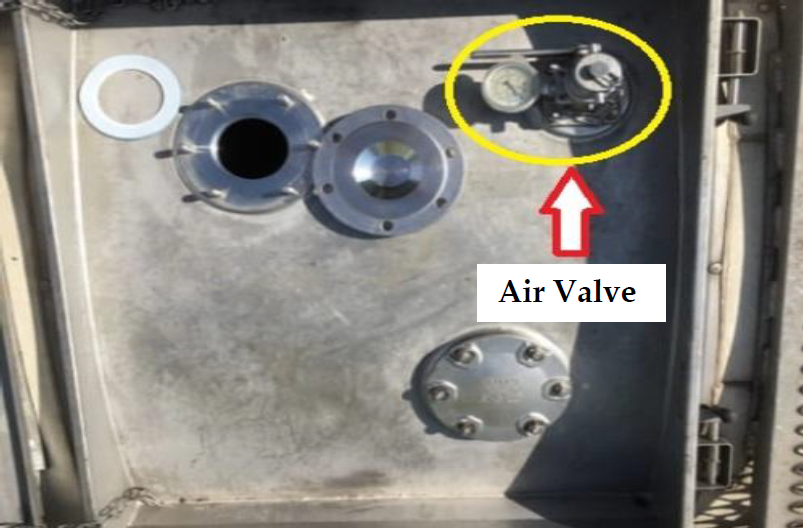 The air valve is mounted on the top of the ISO TANK and sized at 1.5 inches (DN40). Before injecting air or nitrogen, remove the cover and attach the hose. As always, ensure compatibility with factory/warehouse connectors.